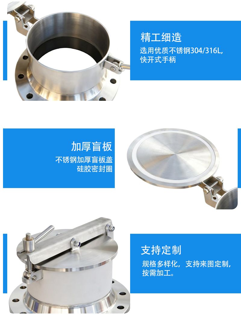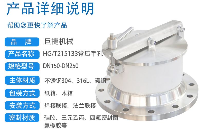 人孔概述:所有压力容器或非压力容器人孔均采用快开式结构,开启方便、*全可靠、外形美观实用,有方形人孔、圆形人孔、椭圆形人孔,承受压力≤0.5MPa。广泛应用于医药、化工、食品等行业的压力罐和反应釜等容器上。也可同时配置视镜、射灯、网格及管道输送连接件。内外镜面光洁度Ra≤0.8μm,内机械抛光与电抛光Ra≤0.2μm,外表面镜面抛光或亚光