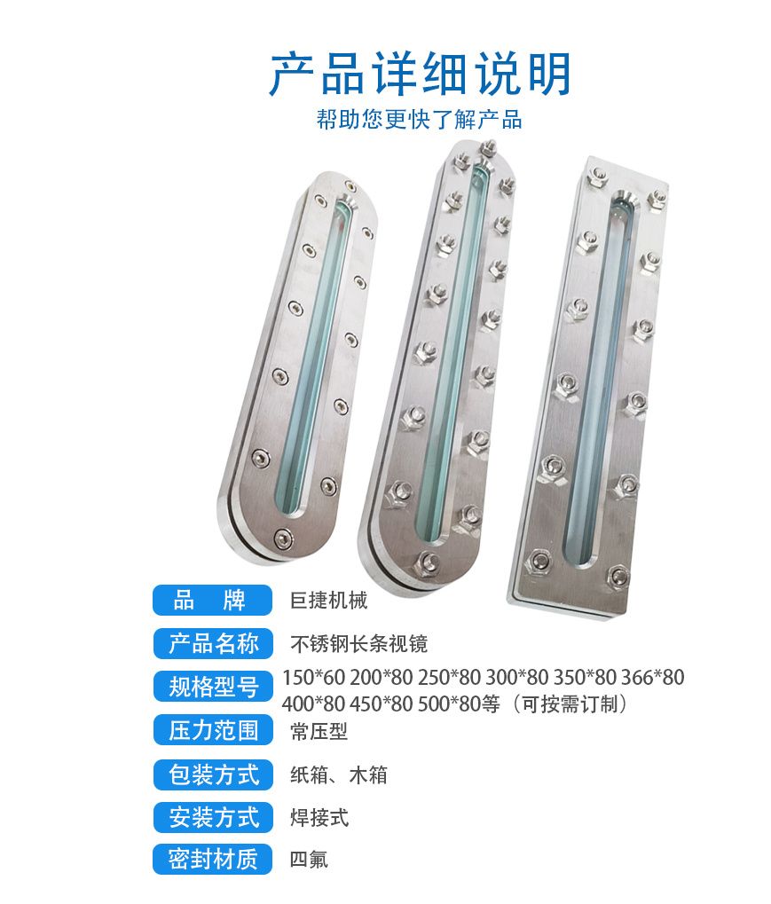 品牌:HG21591.1-95 加工类型:是 视窗材质:钢化玻璃 密封件材质:硅胶 公称直径范围:366*80 密封面:平面(FF) 链接标准:HG 适用对象:不锈钢设备用 型号:巨捷 材料:不锈钢碳钢316L2507 2205 连接方式:焊接 是否厂家:是 发货地:温州 发货方式:快运等 巨捷椭圆形法兰视镜 长条视镜 材料:碳钢 不锈钢304 316L 2205 250747017